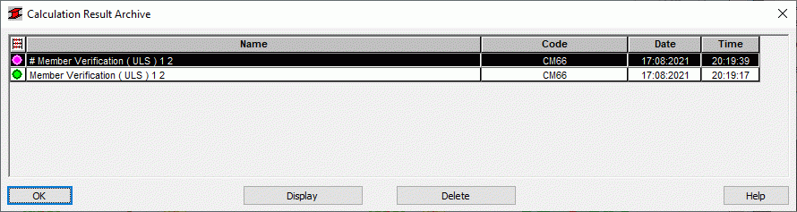 Calculation results saved in the archive are opened by selecting the calculation result in the table and clicking the Display button. To display results of several sessions of member verification / design, highlight several lines, and the appropriate short result windows will open.