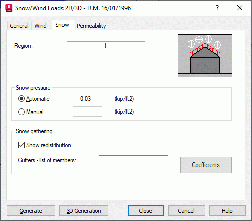 - Snow redistribution - Generates snow loads considering snow slippage from a roof slope, snow blowing off a roof, and snow collecting behind various obstacles on a roof (gutters and acroterions). Default snow loads are generated that account for snow redistribution on roof planes.