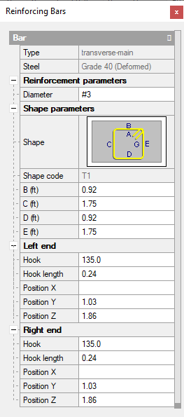 If no reinforcing bar has been selected in the graphical viewer or the table of reinforcing bars, the dialog box will remain empty. If the user selects a reinforcing bar, the dialog box will consist of the three tabs: