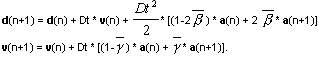 The Newmark method or the method of decomposition is used to solve the above-presented task. The Newmark method belongs to the group of algorithms that are unconditionally convergent for appropriately defined method parameters. It uses the following formulas for calculating displacements and velocity in the next step of integration.