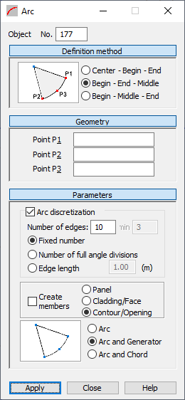 Coordinates for points P1, P2 and P3 can be entered in the corresponding fields under Geometry. The significance of these points depends on the method used to create the arc.