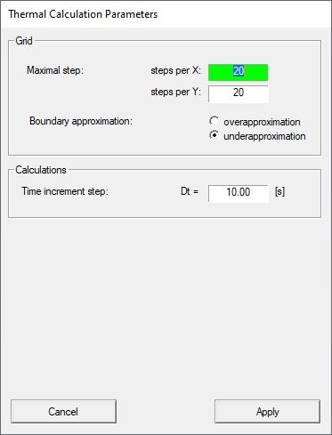 Click Calculation options in the fire resistance calculator menu to open the Thermal Calculations Parameters dialog.