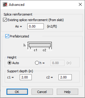 Pressing the Advanced button in the Section definition dialog box results in displaying the dialog box shown above. The options available in the Splice reinforcement field allow one to define the existing reinforcement determined for a slab. The reinforcement area is defined as the are per meter and it will be used in calculations.