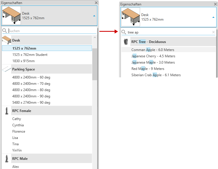 Revit steht eine Suchfunktion zur Verfügung, die die Auswahl in langen Listen von Optionen erleichtert. Sie können in den folgenden Funktionsbereichen suchen: