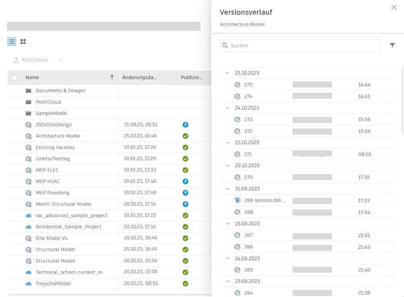Sie können die verschiebbare Gruppe für den Versionsverlauf verwenden, um zu suchen und zu filtern. Modelle werden nach Datum gruppiert.