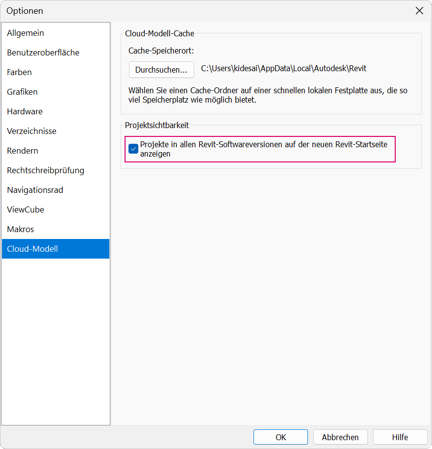 Sie verfügen über eine Sichtbarkeitsfunktion, mit der Projekte aus allen Revit-Versionen angezeigt werden. Projekte in anderen Revit-Versionen als der aktuell ausgeführten werden im deaktivierten Status angezeigt. Sie können diese Funktion aktivieren und deaktivieren. Aktivieren Sie unter Dialogfeld Optionen