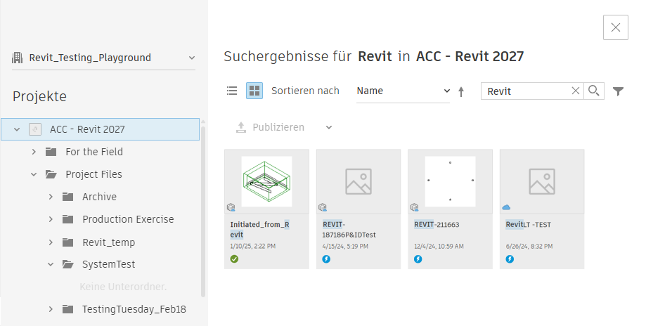 - Suchen Sie nach Projekten und Dateien, filtern Sie nach Änderungsdatum (Alle, Heute, Letzte Woche, Letzter Monat, Letzte 3 Monate) und Typ (Familien und Modelle).