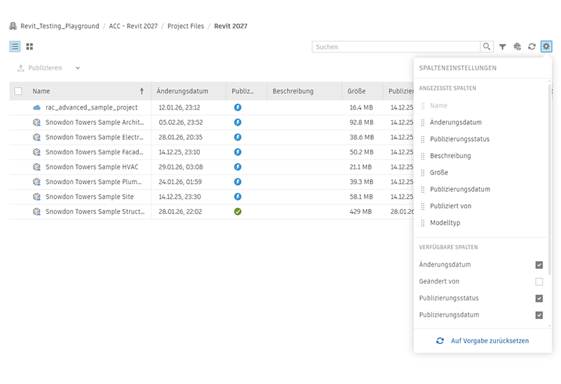 - Raster- und Listenansichten verfügbar. In der Rasteransicht Projekte werden Miniaturansichten der Cloud-Modelle, Symbole für die einzelnen Modelltypen (mit oder ohne Arbeitsteilung) und der Publizierungsstatus mit Symbolen angezeigt.