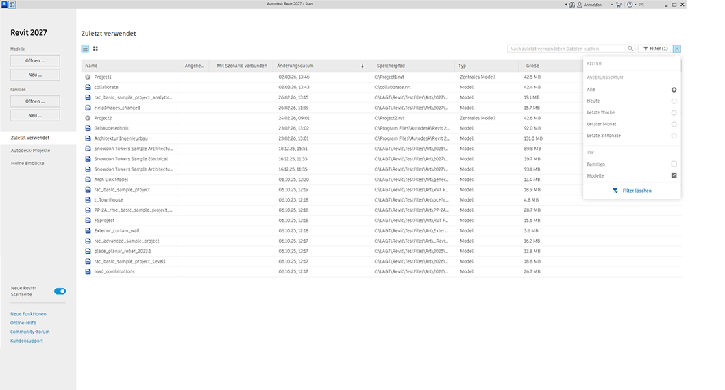 Die neue Revit-Startseite bietet weitere Möglichkeiten zum Anzeigen, Sortieren und Suchen von Modellen und Versionen.