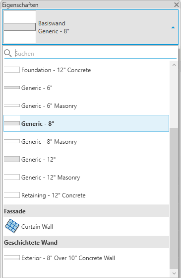 Wenn ein Werkzeug zum Einfügen von Elementen aktiv ist oder gleichartige Elemente in der Zeichnung ausgewählt sind, wird die Typenwahl oben in der Eigenschaftenpalette angezeigt.