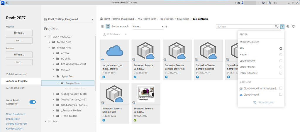 Die neue Revit-Startseite bietet weitere Möglichkeiten zum Anzeigen, Sortieren und Suchen von Modellen und Versionen.