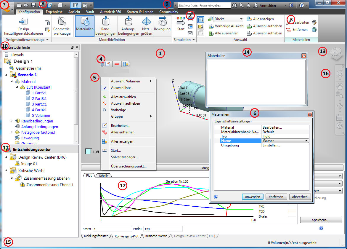 Jeder Bereich der Benutzeroberfläche dient einem wichtigen Zweck, deshalb ist es ratsam, sich mit diesen Elementen vertraut zu machen, da sie zu einer effizienten Nutzung von Autodesk® CFD beitragen.