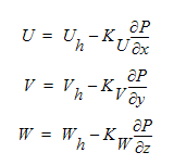 In diesen Gleichungen enthalten die Terme Uh, Vh, Wh alle nicht auf der Diagonalen liegenden Terme in den Impulsgleichungen. Wenn diese drei Gleichungen nun in die vorherige Kontinuitätsgleichung eingebracht werden, ergibt sich die folgende Druckgleichung: