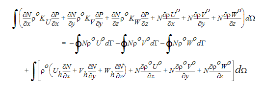 Die ersten drei Integrale auf der rechten Seite dieser Gleichung stellen den Massenfluss über Elementbegrenzungen hinweg dar. Diese Integrale werden an den Elementinnenflächen abgebrochen und sind null für alle Begrenzungen, über die keine Masse fließt (Symmetrie, Wände). Damit stellen diese Terme die natürliche Randbedingung für die Druckgleichung dar.