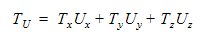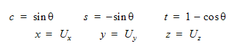 Hier wurde der nicht lotrechte Vektor subtrahiert, um die lotrechte Distanz zwischen dem Ursprung des Umkreisungssystems und der Achse des Drehsystems zu erhalten. Der Vektor (Ux, Uy, Uz) ist ein Einheitsvektor, der die Drehachse für das Umkreisungssystem beschreibt.
