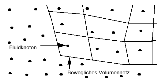 ist die globale Position des Ursprungs des lokalen Koordinatensystems.Anstatt in jeder Zeitebene ein neues Netz zu machen, wird es dem Festkörpernetz gestattet, direkt durch das Fluidnetz durchzukommen. Wenn ein Fluidknoten durch ein Festkörperelement "maskiert" wird, wird die Geschwindigkeit des nächsten Festkörperknotens auf diesen maskierten Fluidknoten angewandt. In diesem Diagramm wird der mit dem Pfeil markierte Fluidknoten durch das Festkörperelement an der Ecke des bewegten Teils maskiert. Alle Fluidknoten innerhalb der Grenzen des bewegten Teils werden als "maskiert" betrachtet, weshalb ihre Geschwindigkeiten vom bewegten Festkörper gesteuert werden.