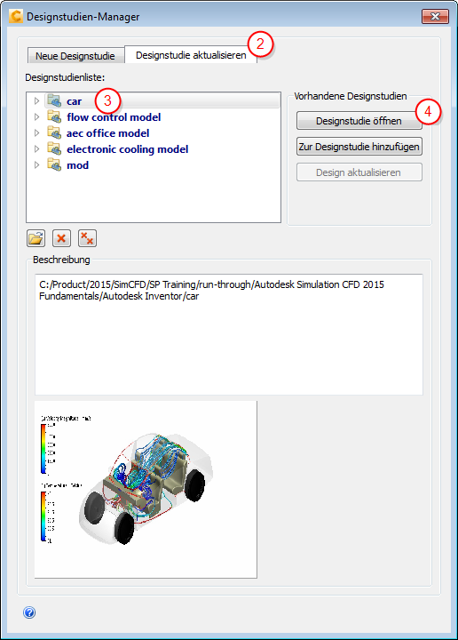 Designstudien-Manager: Öffnen einer vorhandenen Designstudie