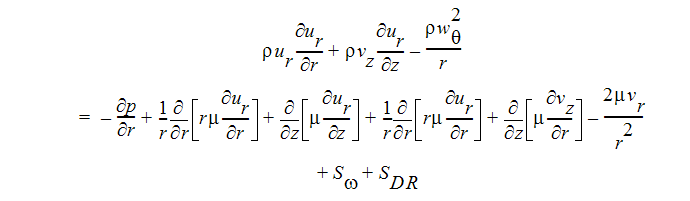 Bei axialsymmetrischen Geometrien und stationären Bedingungen mit Wirbelgeschwindigkeitsanteil (Anteil außerhalb der Ebene) können diese Gleichungen wie folgt geschrieben werden:
