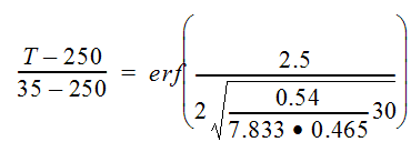 Aus den Eigenschaften der obigen Tabelle und unter Verwendung von 35 C als Anfangstemperatur und 250 C als Randtemperatur wird die Temperatur 2.5 cm vom Rand bei t = 30 Sekunden berechnet: