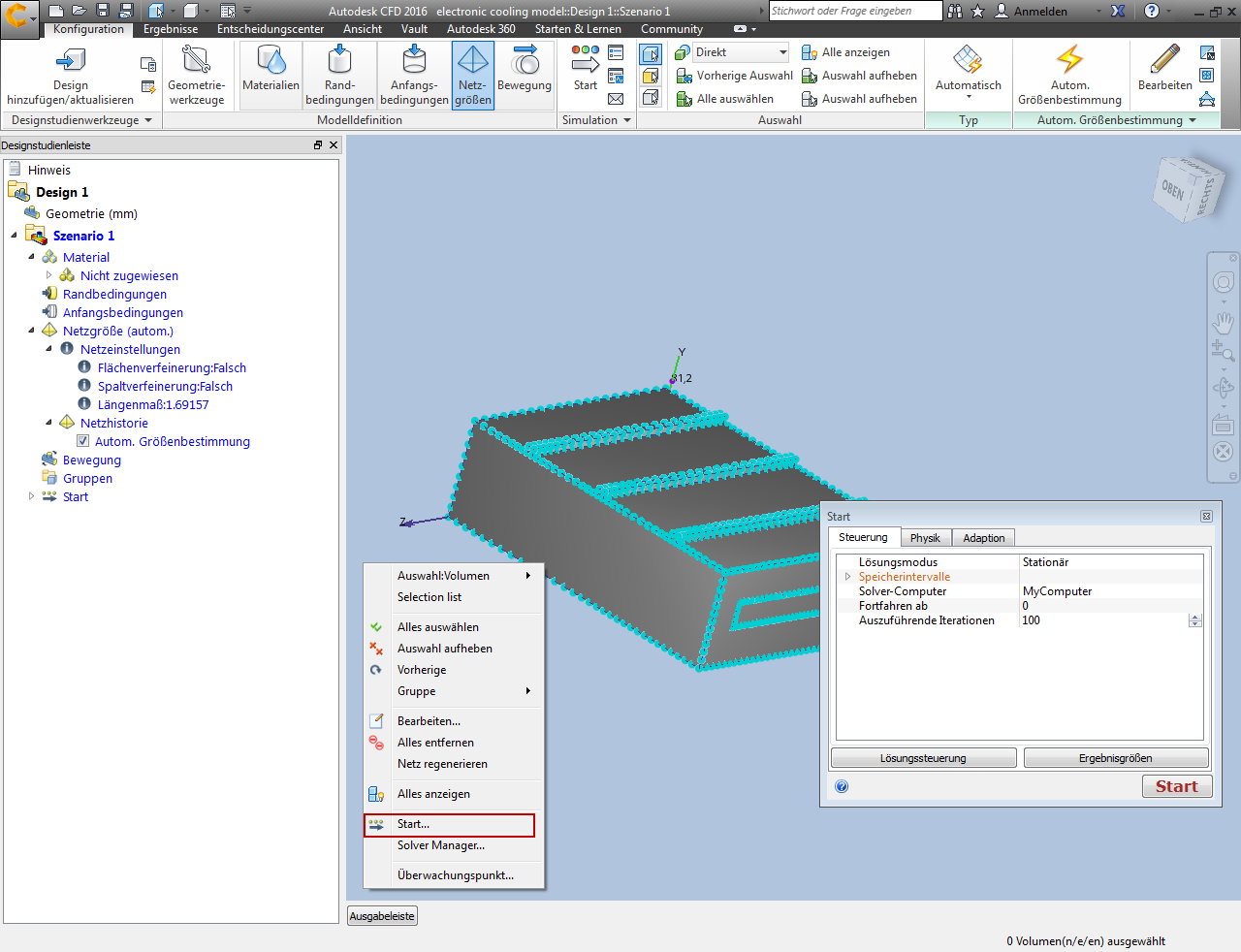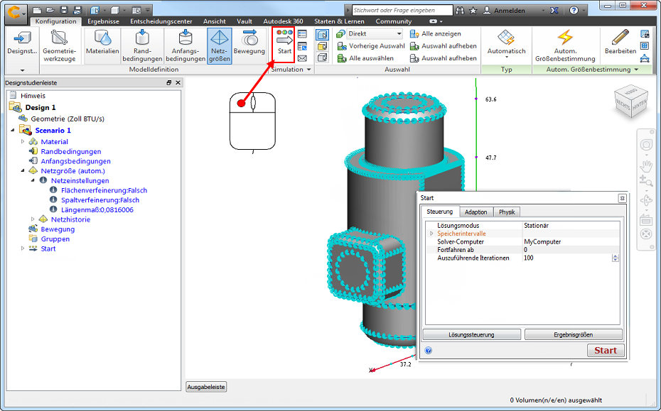 Dieses Thema beschreibt den grundlegenden Arbeitsablauf für die Ausführung einer CFD-Simulation. Das Schnellbearbeitungs-Dialogfeld Start enthält Werkzeuge zum Definieren des physischen Modells, zur Angabe der Speicherhäufigkeit von Ergebnissen und zum Ausführen der Simulation.
