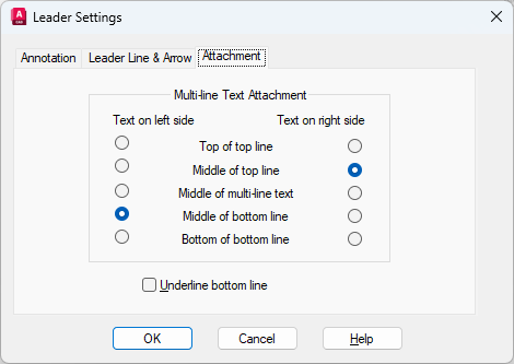 Sets the attachment location for leader lines and multiline text annotation. This tab is available only when Mtext is selected on the Annotation tab.