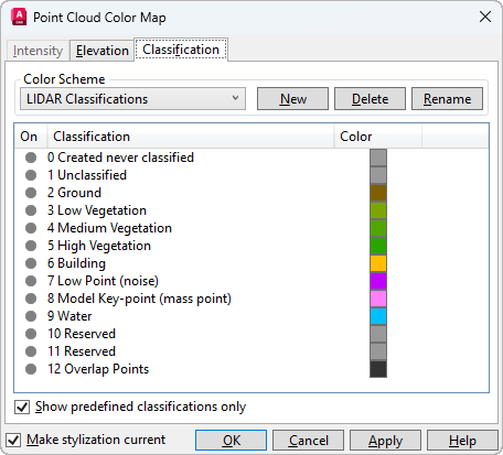 Note: For Intensity, Elevation, and Classification, the stylization is based on the color schemes assigned in the Point Cloud Color Map dialog box (POINTCLOUDCOLORMAP command). If the required data doesn't exist in the point cloud, the option is grayed out in the Stylization drop-down menu.