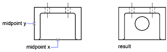 In the following illustration, the hole in the holding plate was centered in the rectangle by extracting the X,Y coordinates from the midpoints of the plate's horizontal and vertical line segments.