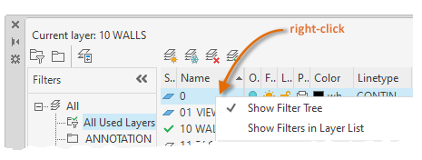 Displays the list of layer filters in the drawing. Click