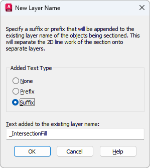 By default, all section block geometry is placed on Layer 0 (zero). However, you can specify suffix or prefix labels to help organize section block components, such as intersection boundaries and fill. When the section block is inserted, the section block components are placed on new layers whose name combines the name of the layer that contains the sectioned object and the prefix or suffix you specify. If the section plane includes objects on two or more layers, two or more new object layers are created.