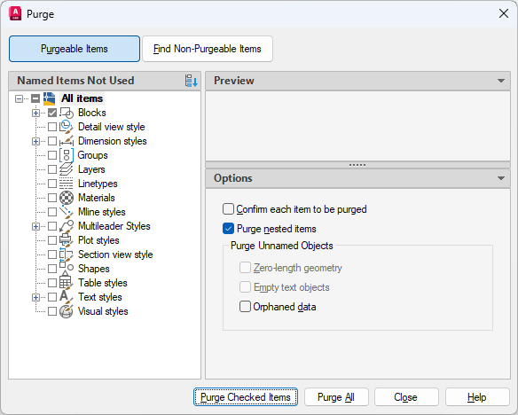 Lists the items in your current drawing that you can purge in the tree view pane on the left side. Additional items can be removed from the drawing under the Purge Unnamed Objects pane on the right side of the dialog box.