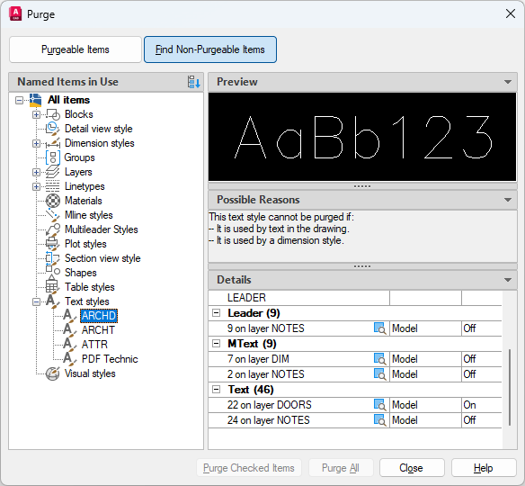 Most of these objects are currently used in the drawing or are default items that can't be removed. When you select individual named objects, information about why you can't purge the item is displayed.