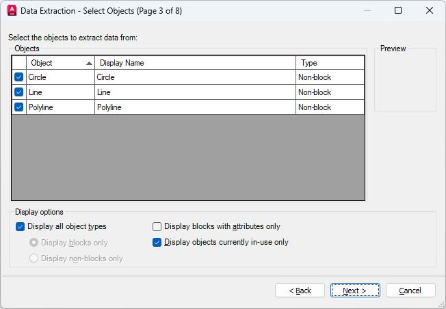 Specifies the types of objects (blocks and non-blocks) and drawing information to be extracted.