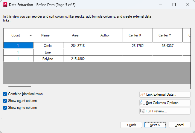 Creates a table that is populated with extracted data. You are prompted to insert the table into the current drawing when you click Finish on the Finish page.