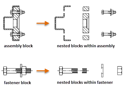 Block references that are included in a block definition are called nested blocks. Using blocks within blocks can simplify the organization of a complex block definition.