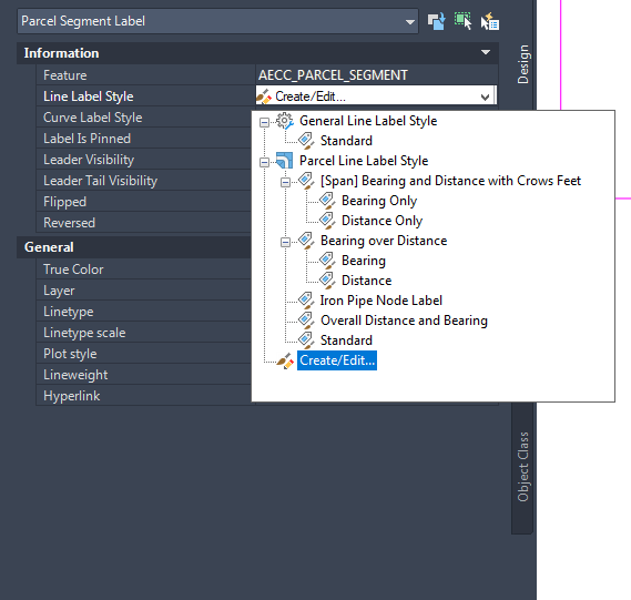From the styles pull-down menu in the Properties palette, select Create/Edit (as shown in figure 13) to access the Object (Plot Line Label) Style dialog box as shown in figure 14.