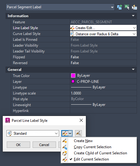 The Properties palette also provides access to the Label Style Composer through the Edit Current Style option. This allows for more uninterrupted style property editing because you do not have to navigate to the Toolspace Settings tab.