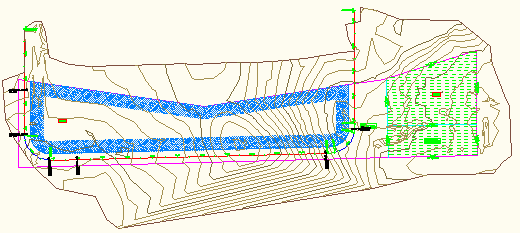 Now the drawing displays borders, level differences indicated by color, and slope direction arrows and appears as shown in figure 8. The contour lines are no longer visible. These changes now reflect the components that are enabled for the supplied Finish Gradient surface style.