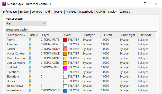 Open the sample styles drawing, Sample_styles.dwg, in C:\Program Files\AutoCAD 2027\C3D\Help\Civil Best Practices Guide. The surface styles are designed to display different components of a surface at different design stages. The surface style assigned to the drawing is called Existing Ground Contours. This is an example of a style that would be used during the design stage of a project.