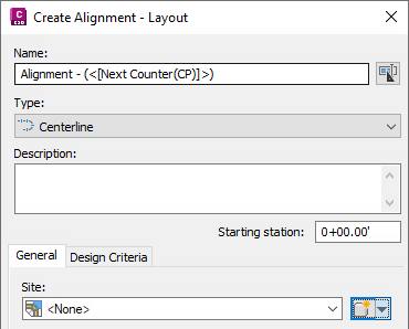 When you create an alignment with the Create Alignment - Layout or Create Alignment - From Polyline dialog boxes, the default is to create the alignment with no specified site <None> as shown in figure 2.