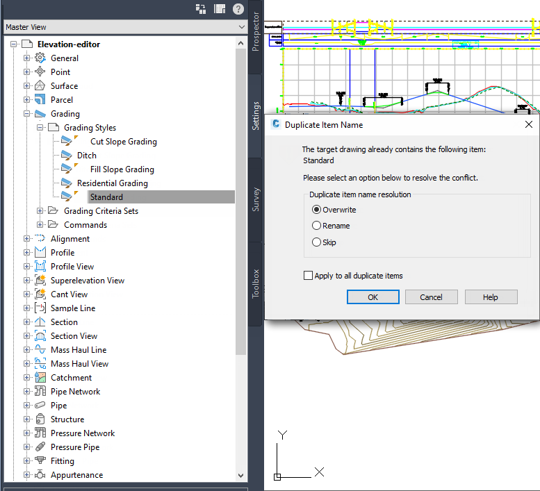 In the example shown in figure 9, the Grading Standard style was selected from the Sample_styles.dwg, and dragged and dropped onto the Breaklines.dwg name.
