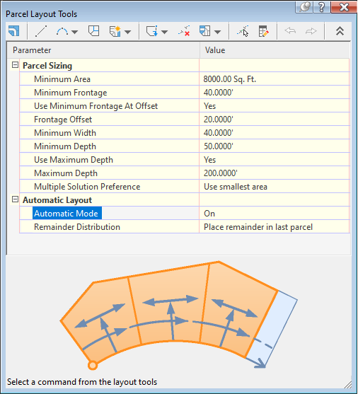 You can use the additional parameters, such as frontage offset, minimum width and depth for even greater precision when you initially lay out the plots. The plot sizing parameters allow for a continuous workflow. If you reject a proposed solution, you can simply adjust the parameters and the preview graphics update dynamically.