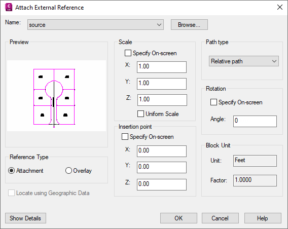 The xref data is highlighted with dashed lines when selected. The xref commands affect the corresponding labels in various ways. If you detach or bind the xref, the label is deleted and must be recreated.