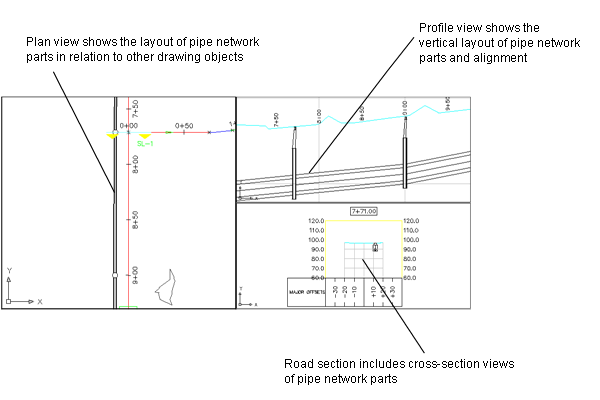 This illustration displays three viewports: the pipe network in plan view, the profile view of some of the network pipes and structures, and the same parts in a section view.