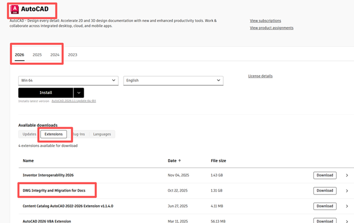 The DWG Integrity and Migration for Docs installer is available on manage.autodesk.com and is accessible only to customers with a valid AutoCAD or Civil 3D 2024-2026 licence.