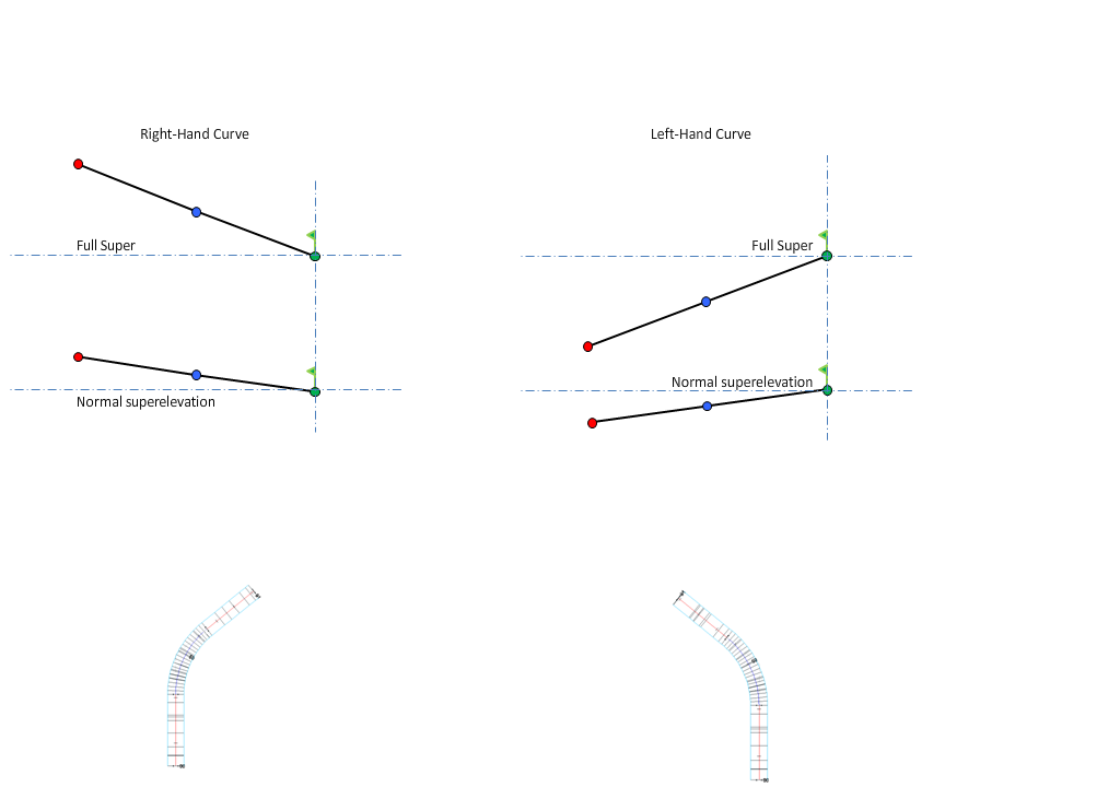 For an explanation of superelevation diagrams, see About Superelevation Axis of Rotation Pivot Methods.