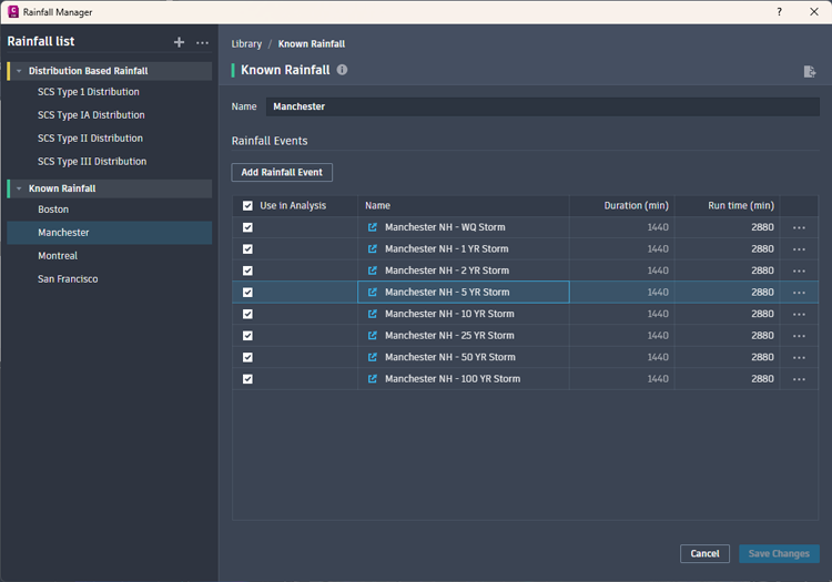 The Rainfall Manager provides a centralized location for creating, editing and managing all rainfall data used in the software. This includes both pre-defined rainfall patterns and user-created custom events. Organize rainfall data into common sets, ensuring easy access and consistent application across different analyses.
