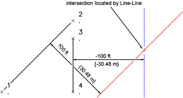 An intersection is located between a line drawn between points 1 and 2 with an offset of 100 feet to the right and a line drawn between points 3 and 4 with an offset of 100 feet to the left.