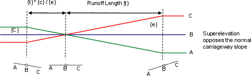 The Opposing section defines the overall transition distance to be the runoff length {t}. The distance to the Beginning of Curve is a percentage of {t} based on the variable {p}, and the distance between the Normal Crossfall and Level Crown chainages is {t} * {c} / {e}.