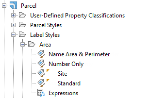 In the Toolspace Settings tree, Label Styles collections contain one or more types of label styles that represent a unique aspect of the object using it. The following illustration shows the hierarchy of the label style collection, the label style types, and the individual label styles:
