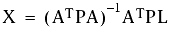 The computed matrices A, P, and L are now plugged into the matrix formula for a system of weighted observations to solve for the X matrix, as stated previously: